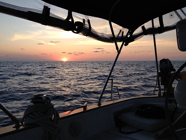 The next 30-hours delivered on the forecast’s promise: calm seas, little wind, occasional rain, and lighting; always lighting. Sitting in an ungrounded tub fitted with the tallest metal thing for miles around, lighting is of particular concern for sailors and the constant flashes kept up a mild tension among the crews of Delancey and Kairos throughout the night. Happily, the lighting was mostly kept to the upper atmosphere, with only distant vertical forks touching ground on the horizon.