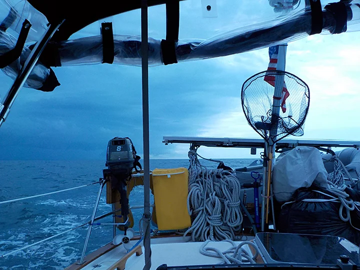 But there’s another wrinkle: these conditions; light and variable winds and a calm sea state; are usually caused by a stalled frontal system or two that blocks the prevailing eastern trade winds. Stalled fronts bring squalls of rain, wind, and lighting. It was into just such a system that we departed Samaná early the next morning, motoring in company.