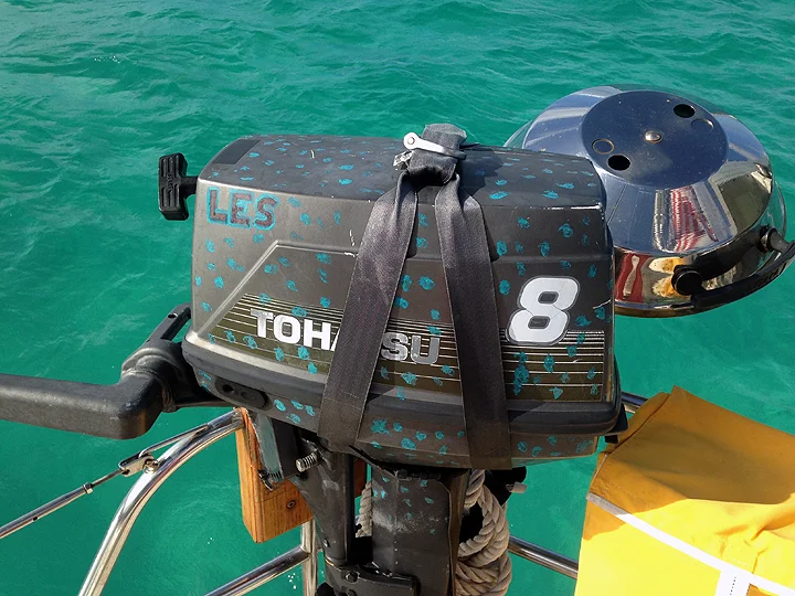 In St. Martin, and the bulk of the Leeward and Windward islands, dinghy and outboard theft is more prevalent than what we’ve experienced previously. One step in my multi-pronged effort to combat this is to make our dink as unattractive as possible. A year of cruising has already taken its toll on LES, our 10-foot inflatable. My next step was to customize our old 8hp Tohatsu 2-stroke outboard with Deb’s least-favorite color of nail polish. (More anti-theft prongs to follow.)