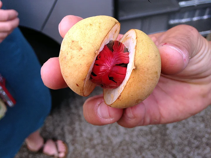 Cutty showed us nutmeg on the tree, pointing out how the fruit splits open when it’s ready for harvest. Inside we could see the brown nutmeg seed surrounded by crimson mace, described as “the lady in the boat with the red petticoat.”