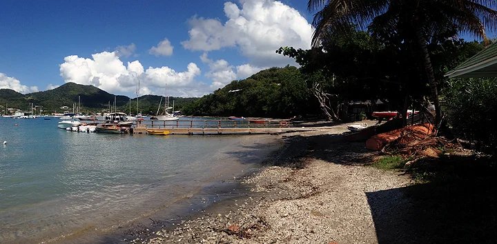 Wait, what’s a Q-flag, you ask? It’s a small signal flag hoisted in the rigging, this one is solid yellow and stands for the letter Q in flag signal code. In this case, the “Q” stands for “Quarrantine”, and signals that you have not yet cleared into the country. Here’s how it works: You enter a new country flying your Q-flag. You gather up your passports, boat documentation, and last country’s clearance papers (you keep all this in a folder). The captain (or, in the case of a two-person crew, everybody) goes ashore to Customs and Immigration where you fill out more papers, pay a small fee, and “clear-in” to the country. Then you go back to your boat, take down the Q-flag, and hoist up a small national flag (a “courtesy flag”) of the visited country in its place. You do it all again when it’s time to “clear-out”. Each country has its own minor variations (the French islands have self-service terminals that make it very easy), but that’s the basic process. So, by Q-flagging our way down, we were technically never “in” St. Lucia or St. Vincent and the Grenadines (the country of Bequia and Union Island).